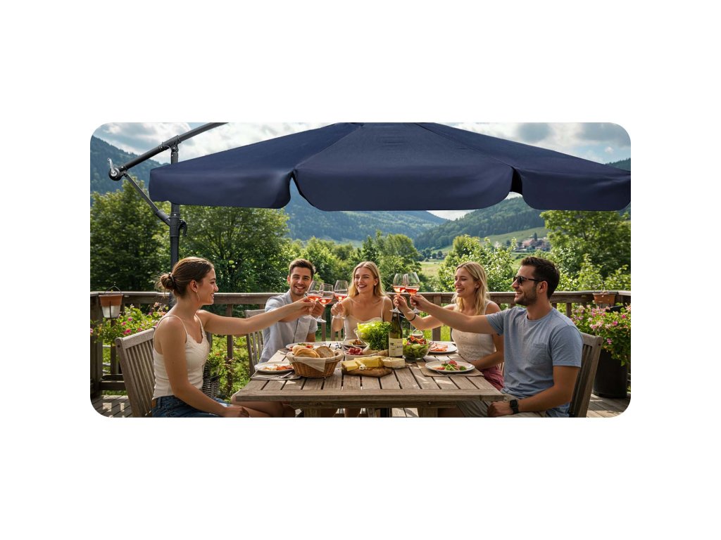 - Posibilitatea de plasare liberă a umbrelei: înălțime + unghi de înclinare.