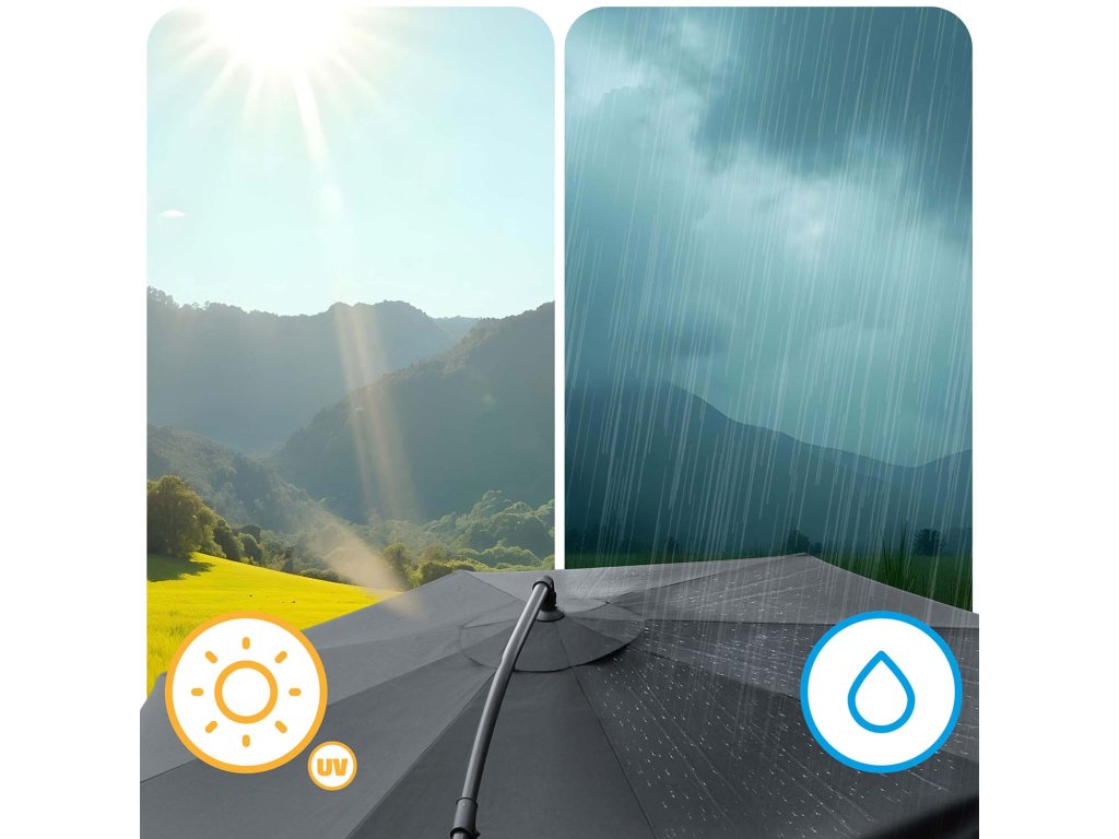 - Ploaie Nu are nicio șansă! Datorită materialului rezistent la apă PE , umbrela noastră protejează eficient împotriva fiecărei picături.