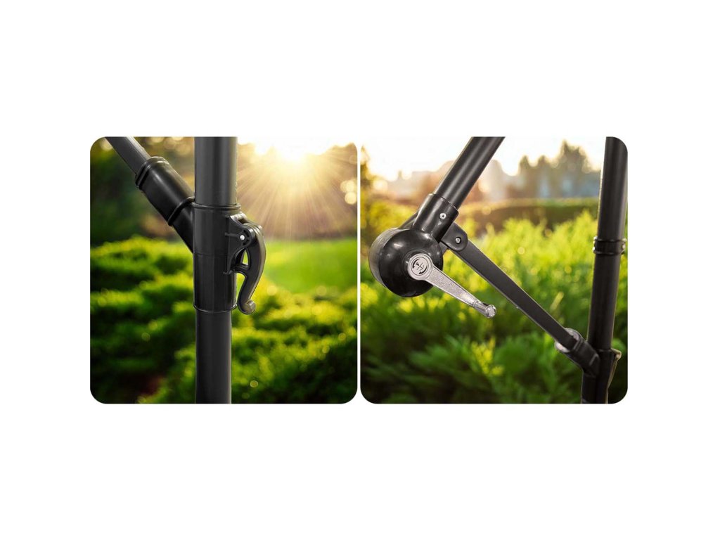 - Brațul lateral stabil permite reglarea lină a unghiului de înclinație, astfel încât să ajustați acoperirea la condițiile meteorologice actuale.