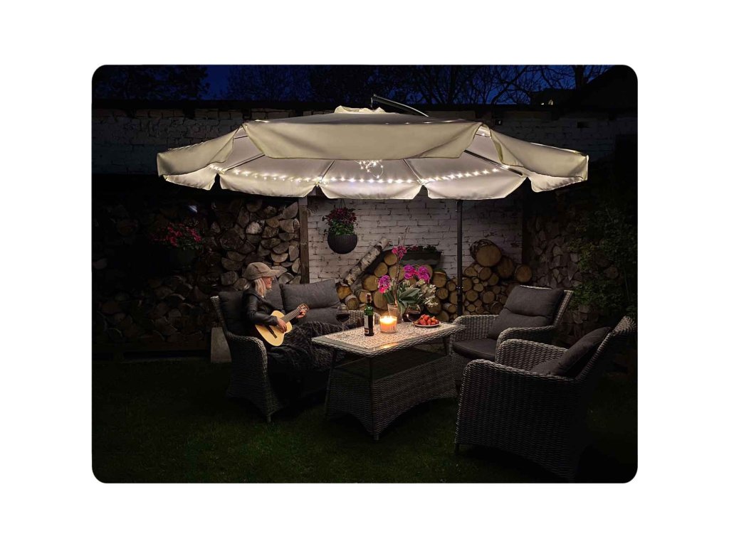 Pe de altă parte, va fi o sursă de umbră liniștitoare în zilele fierbinți, iar orificiul de ventilație situat în partea superioară a umbrelei va asigura circulația aerului.