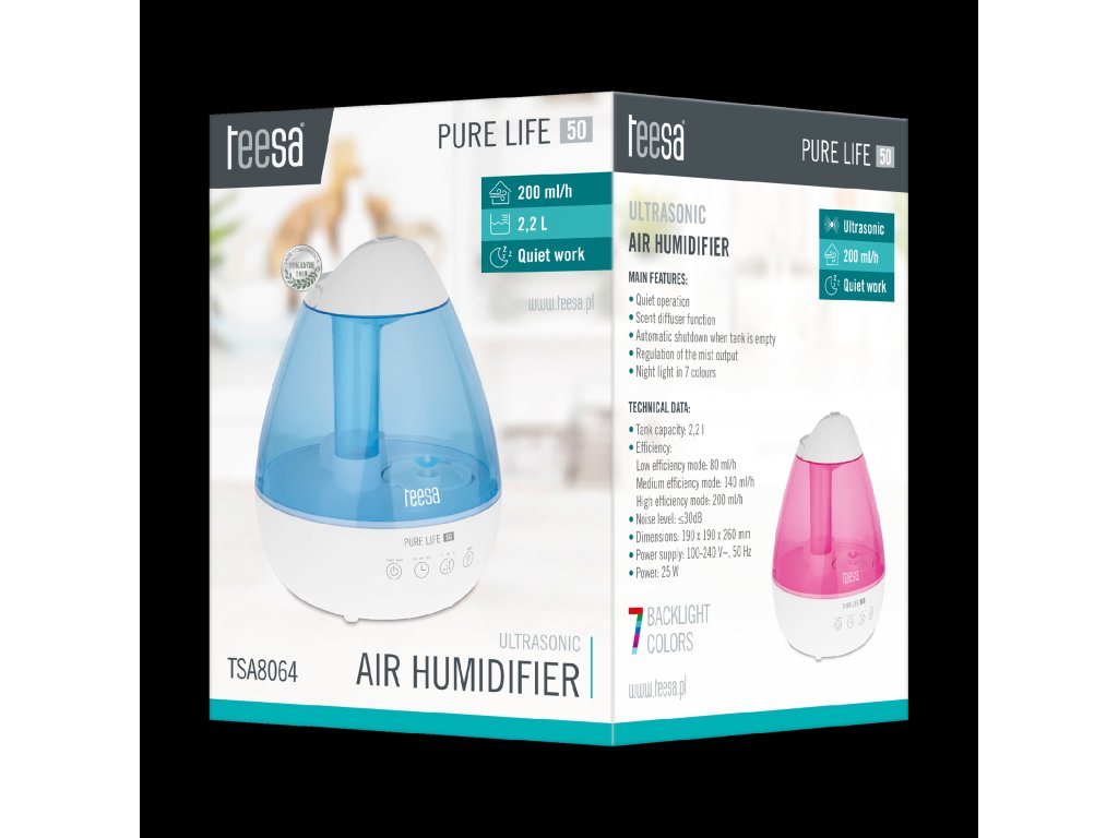 Aveți grijă de sănătatea dumneavoastră și alegeți Teesa PURE LIFE 50. Acest umidificator mic îmbunătățește semnificativ calitatea aerului din casa dumneavoastră și vă permite să respirați cu plămânii plini. Funcționarea acestui dispozitiv se bazează pe utilizarea undelor ultrasonice, asigurând un funcționare foarte silențioasă și un consum redus de energie.