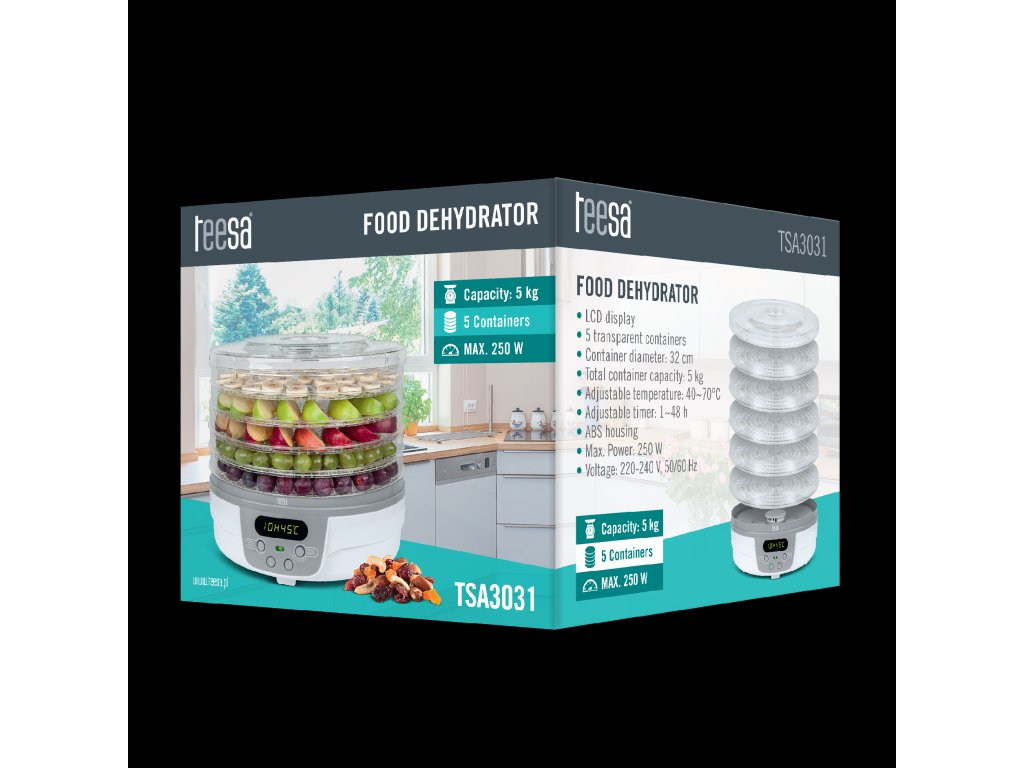 Uscătorul TSA3031 este echipat cu cinci site cu un diametru de 32 cm, care vă permit să uscați până la 5 kg de alimente. Acum vă puteți bucura de o doză de vitamine naturale indiferent de anotimp sau să vă surprindeți prietenii cu gustări sănătoase la întâlniri. Putere maximă: 250 W
