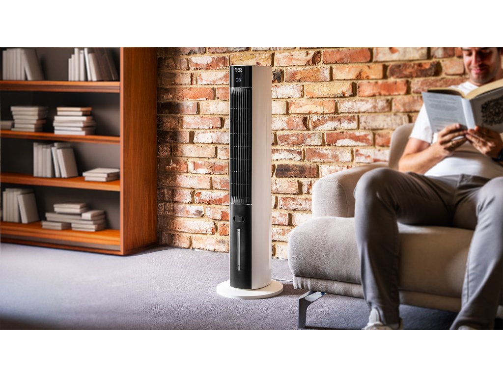 Ventilatorul stâlp rotativ Teesa dispune de un rezervor de apă de 3 litri, ușor de scos, reumplut și curățat. Două cartușe de răcire incluse în pachet măresc eficiența. Ventilatoarele stâlp cu apă sunt o alegere excelentă pentru zilele și nopțile toride.