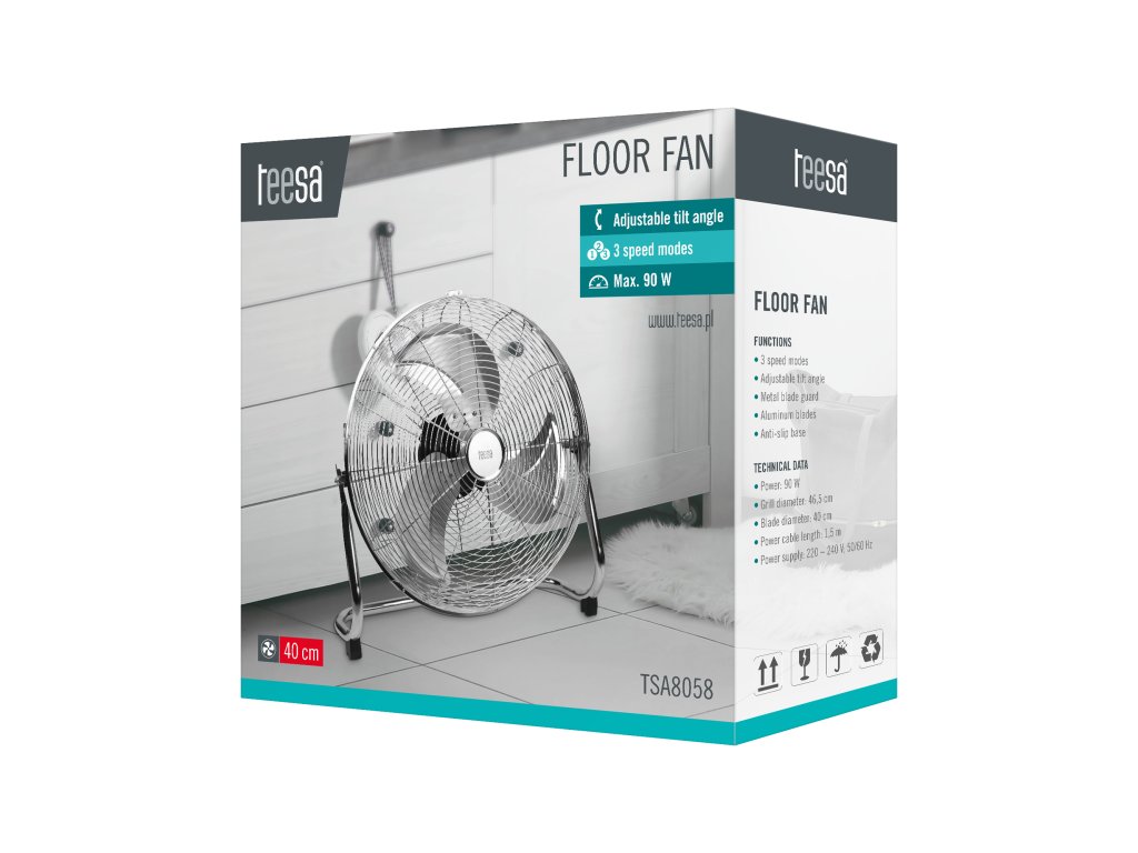 Ventilatorul de podea Teesa este o combinație între design modern, eficiență și siguranță. Datorită funcționalității sale, va fi un element indispensabil pentru casa sau firma dumneavoastră, asigurându-vă momente plăcute și confortabile în cele mai fierbinți zile.