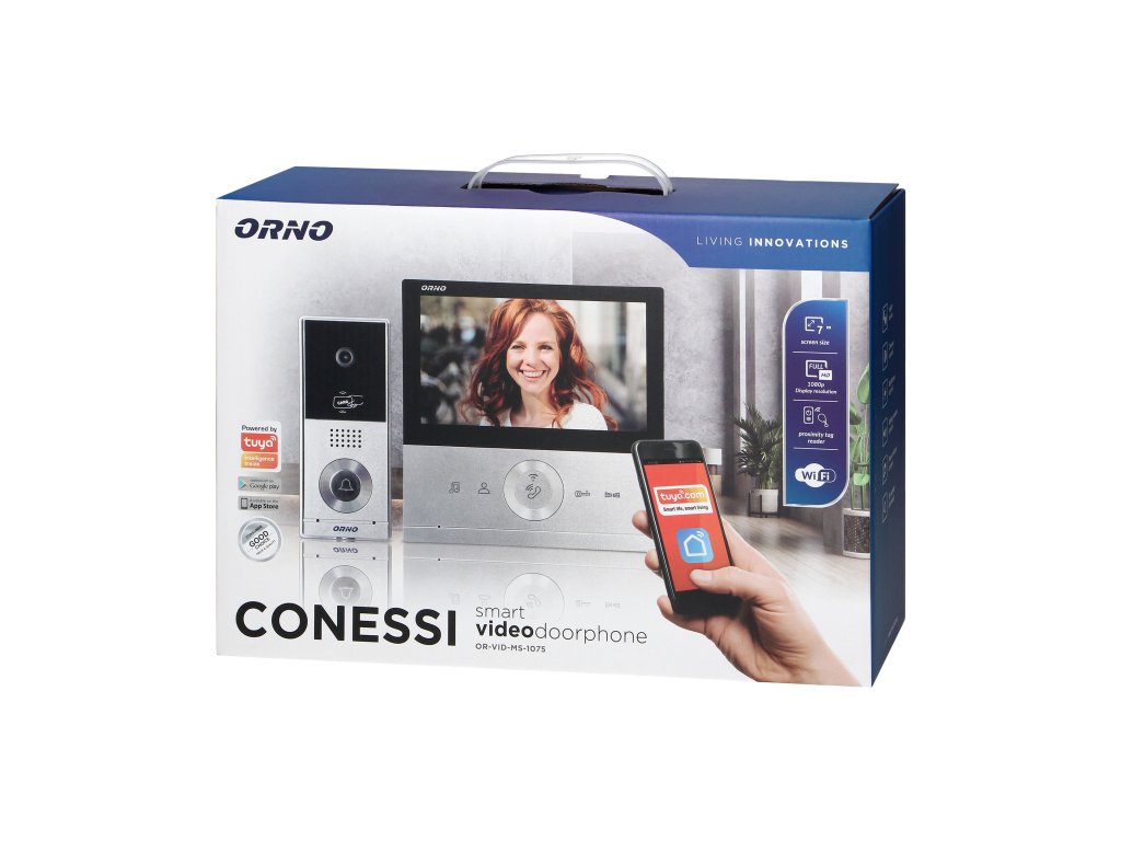 Interfonul video modern CONESSI Full HD constă dintr-un monitor color LCD ultrafin de 7'' care oferă o imagine de calitate excelentă și o casetă externă cu o cameră Full HD cu un unghi de vizualizare foarte larg. Panoul exterior este echipat cu un adăpost care oferă protecție împotriva ploii sau zăpezii, precum și împotriva razelor solare intense. Comunicarea între panourile interioare și exterioare nu necesită receptor. După descărcarea aplicației gratuite TUYA, utilizatorul poate controla dispozitivul de pe smartphone-ul său și înregistra sunete și videoclipuri prin aplicația Tuya și le poate reda pe smartphone-ul său. Iluminarea suplimentară cu LED-uri IR pe panoul exterior permite vedere pe timp de noapte și cititorul RFID încorporat permite accesul folosind carduri fără contact și brelocuri.