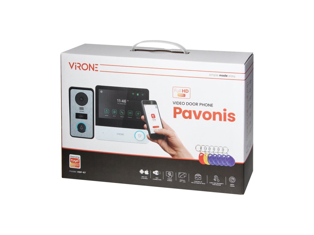 Videointerfon PAVONIS B, un set de videointerfon destinat iubitorilor de soluții tehnologice confortabile care facilitează viața. Se conectează la Wi-Fi și la aplicația specială Tuya, permițând controlul ușor al intrărilor și evenimentelor din jurul proprietății, chiar și atunci când nu e nimeni acasă, și, cu ajutorul unui card SD suplimentar, permite stocarea înregistrărilor și fotografiilor acestor evenimente.Setul este compus dintr-un monitor și o unitate exterioară.
