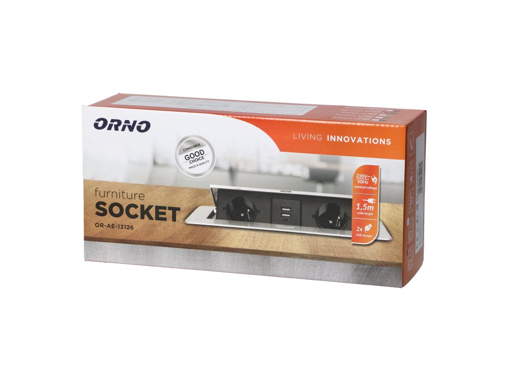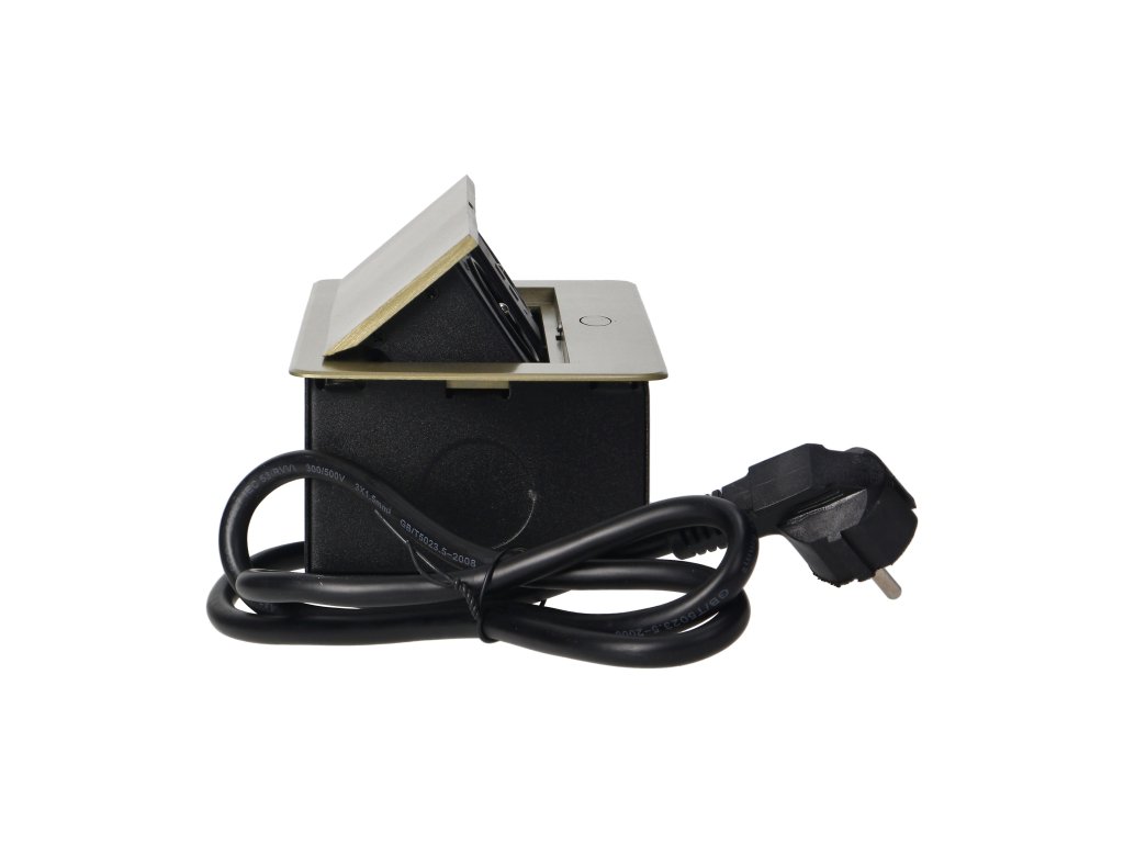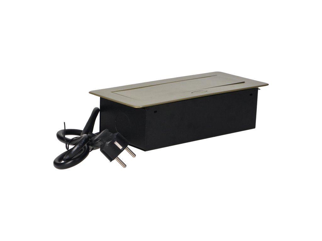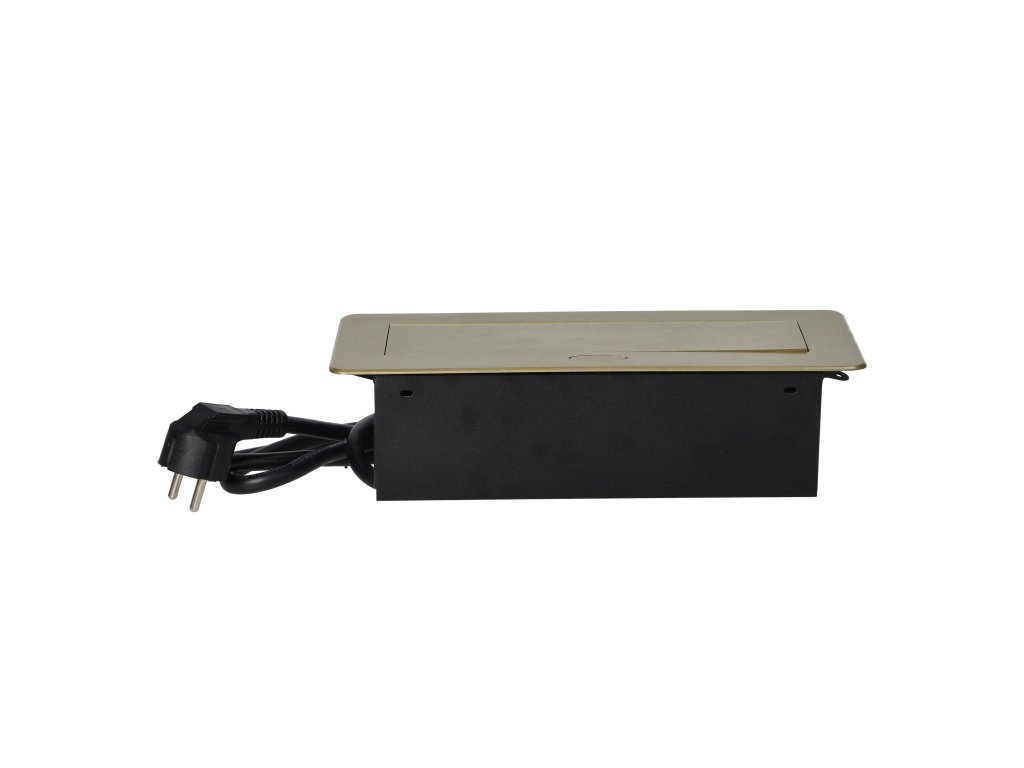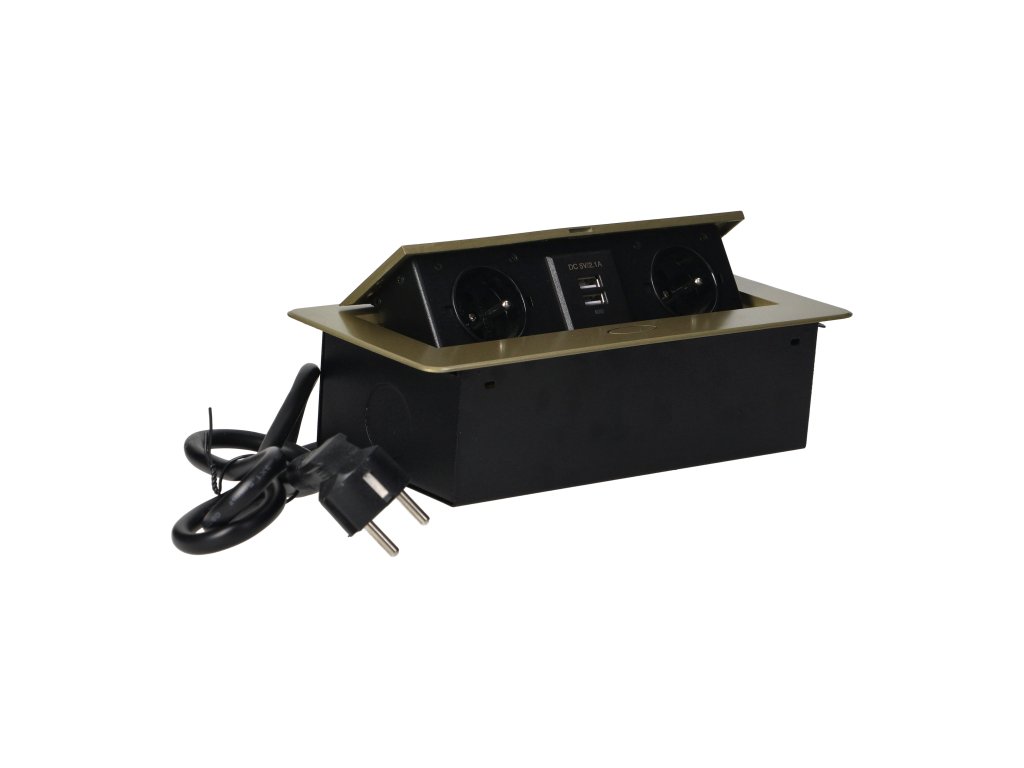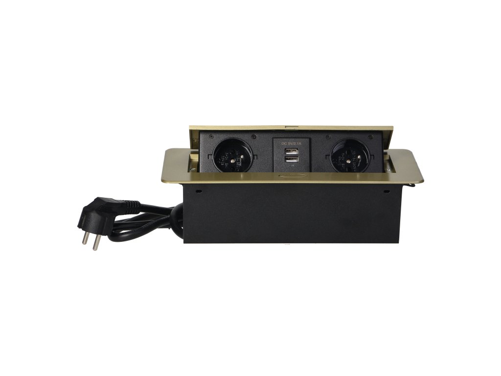 Súprava dvoch sieťových zásuviek s uzemnením a prúdovou ochranou v kombinácii s nabíjačkami USB zabudovanými do puzdra, ktoré možno integrovať do stolov, pracovných dosiek a stolov, sa dá namontovať vertikálne aj horizontálne a poskytuje pohodlný prístup k elektrickým zásuvkám. Vďaka plochej hrane (len 2 mm) kryt so zásuvkami dokonale zapadne do povrchu napr. stola a neprekáža pri jeho čistení. Súprava má predinštalovaný 1,5 m kábel. Farba - mosadz.Technická špecifikácia:
